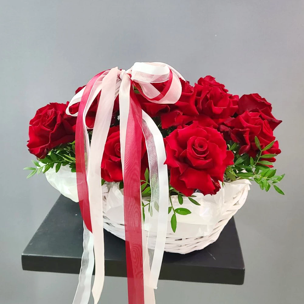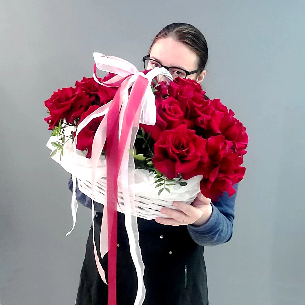 Плетеная корзина придаёт букету особую основательность и презентабельность, делая его самостоятельным, завершённым подарком, который не требует вазы.