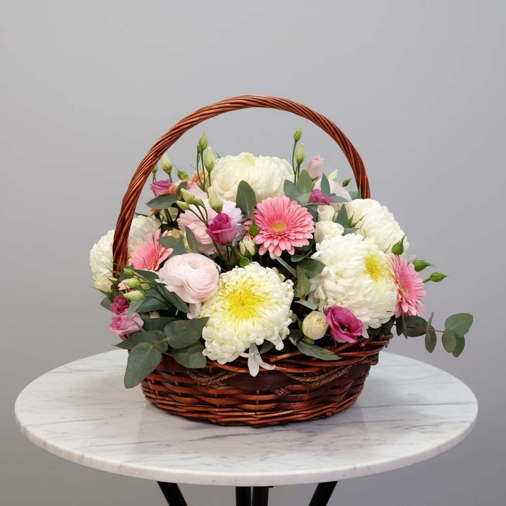 Белые и розовые хризантемы, герберы, эустомы, кустовые розы и эвкалипт в плетёной корзине из ивы. Благородство, нежность и статус в каждой детали.