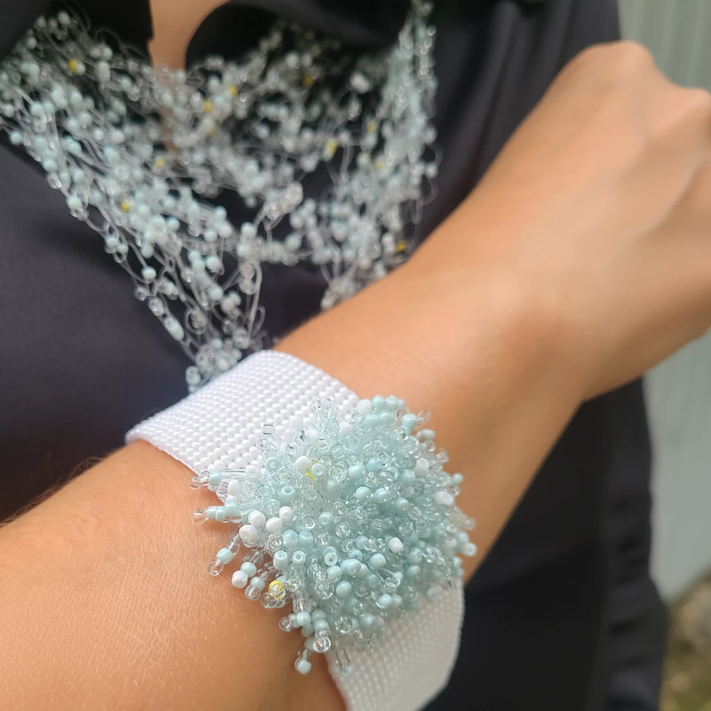 Браслет ручной работы из чешского бисера с необычным дизайном. На белой основе расположился объёмный элемент в виде коралла, сплетённый из голубого, белого и прозрачного бисера. Аксессуар напоминает о морском бризе, коралловых рифах и беззаботных днях у воды.