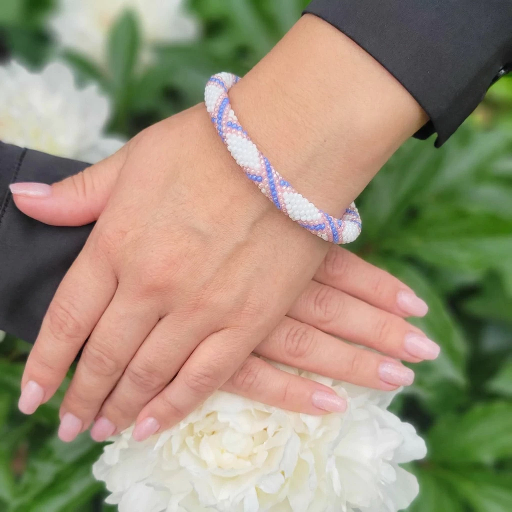 Браслет ручной работы, связанный с использованием чешского бисера высокого качества. Белая основа и аккуратный рисунок из пересекающихся линий синего и нежно-розового цвета создают эффектный геометрический узор — строгий, но при этом мягкий и женственный.