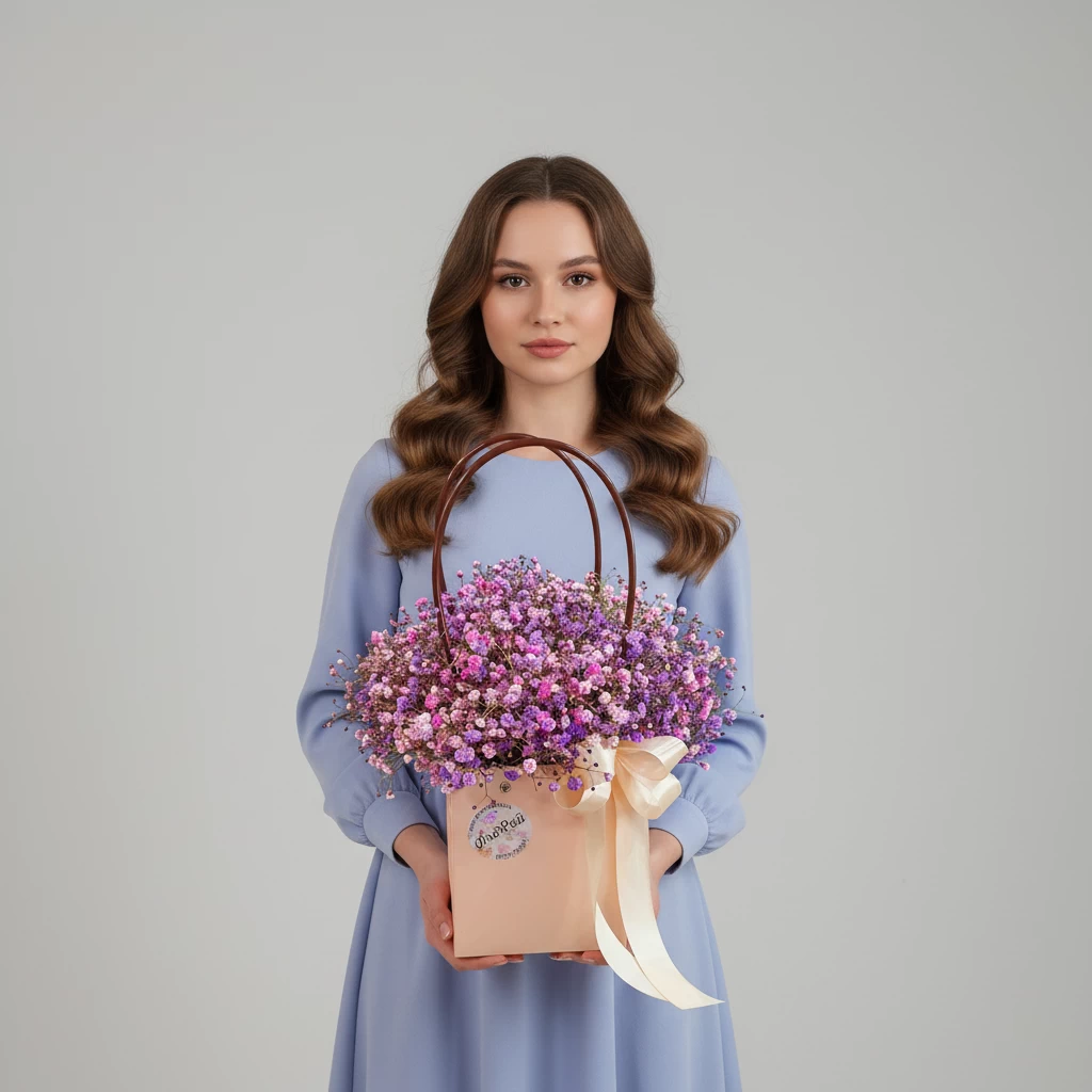7 веток гипсофилы (розовая, фиолетовая, лавандовая) в стильной сумочке с ручками. Подарок, который остаётся с вами на годы. Секрет долговечности — внутри.