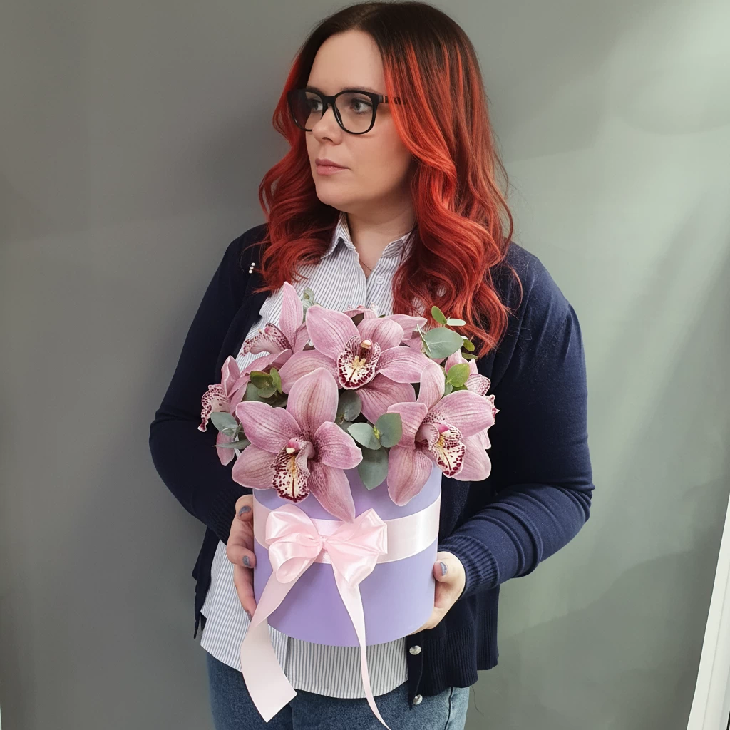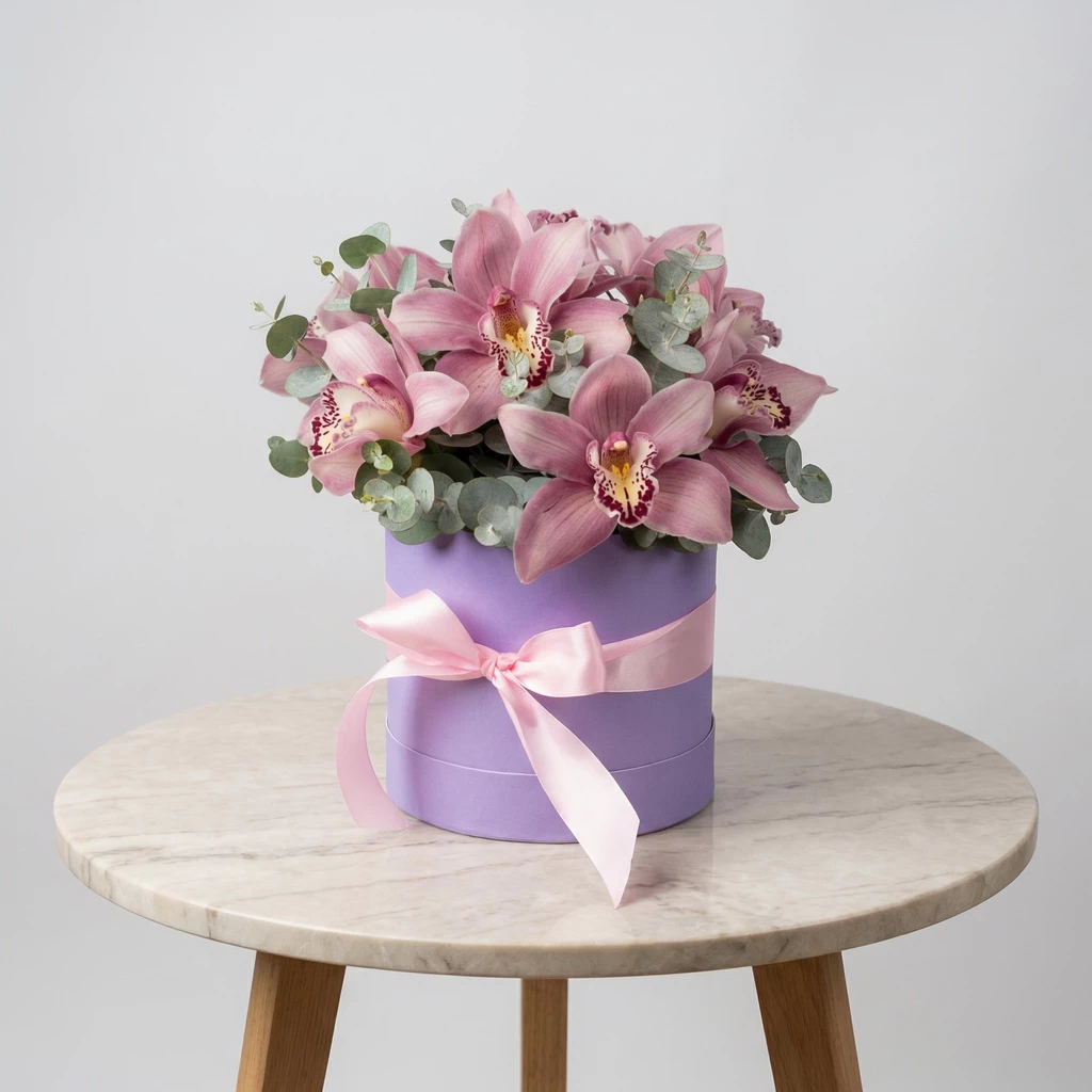 9 розовых орхидей Цимбидиум, свежий эвкалипт и элегантная шляпная коробка. Красота, которая не требует вазы — только немного внимания и воды.