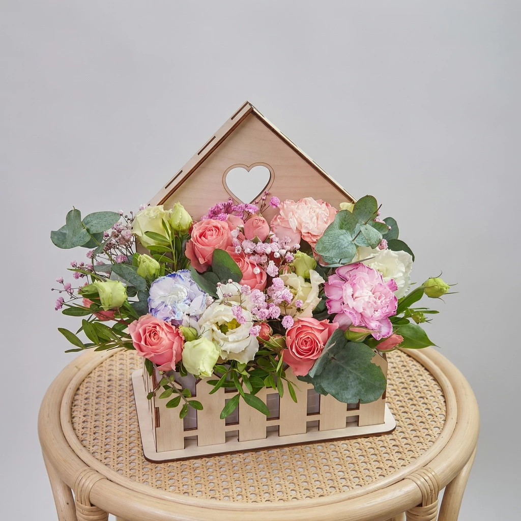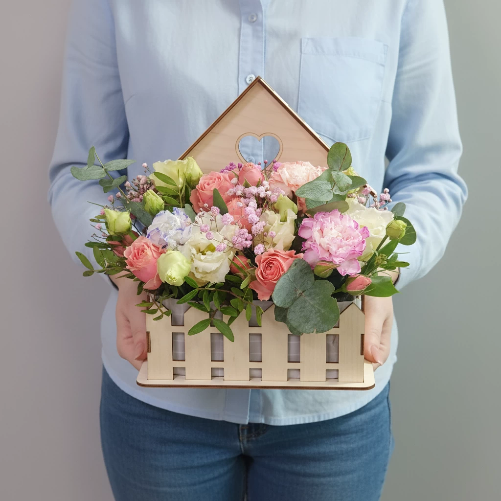 Нежно-розовая эустома, коралловая кустовая роза, три оттенка диантуса, фисташка, эвкалипт и гипсофила — в деревянном кашпо в форме дома. Для тепла, для уюта, для семьи.