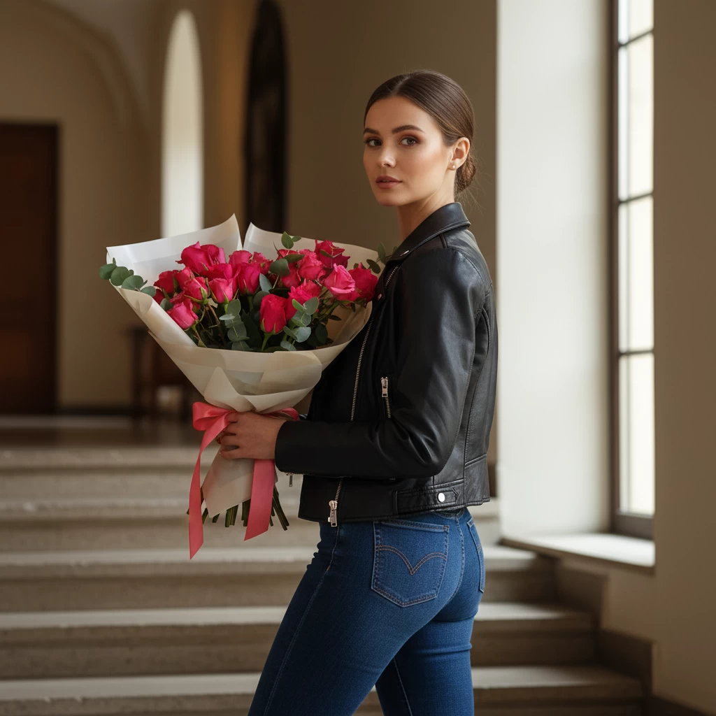 В основе букета — сочетание сортовых и премиальных кустовых роз. Это дуэт, где классическая благородная форма встречается с современной пышностью и объёмом. Премиальные кустовые розы дарят букету роскошь множества бутонов на одном стебле, а сортовые розы добавляют акцентной красоты и утончённости.