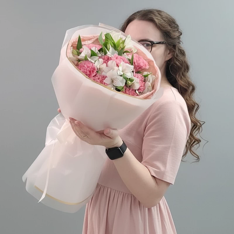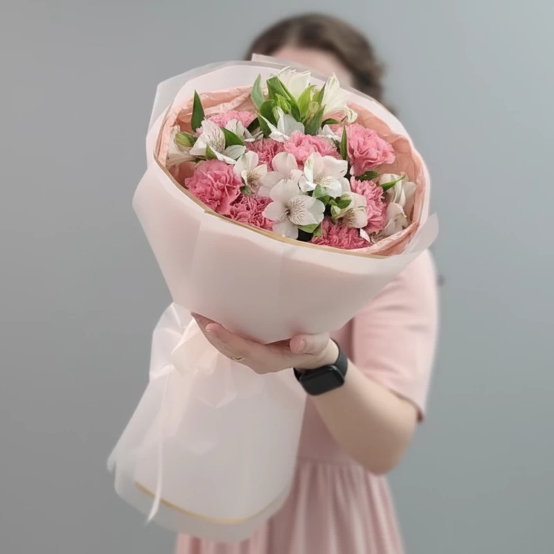 В основе букета — дуэт самых стойких цветов: альстромерии и диантуса. Они не боятся ни забытой воды, ни перемены температуры, даря свою красоту щедро и долго.