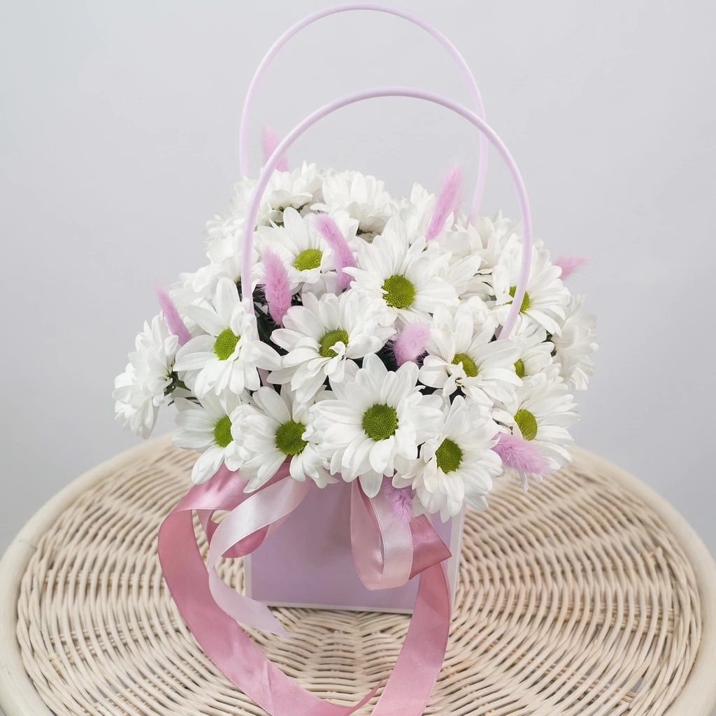 Эта композиция оправдывает своё название на все сто. Такая же яркая, аппетитная и невероятно милая, как любимые детские сладости. «Мармелад» — это настоящий восторг в розовом цвете. Пышные хризантемы и пушистые лагурусы в стильной сумочке создают ощущение праздника, лёгкости и той самой «сладкой» радости, которая так нужна каждый день.