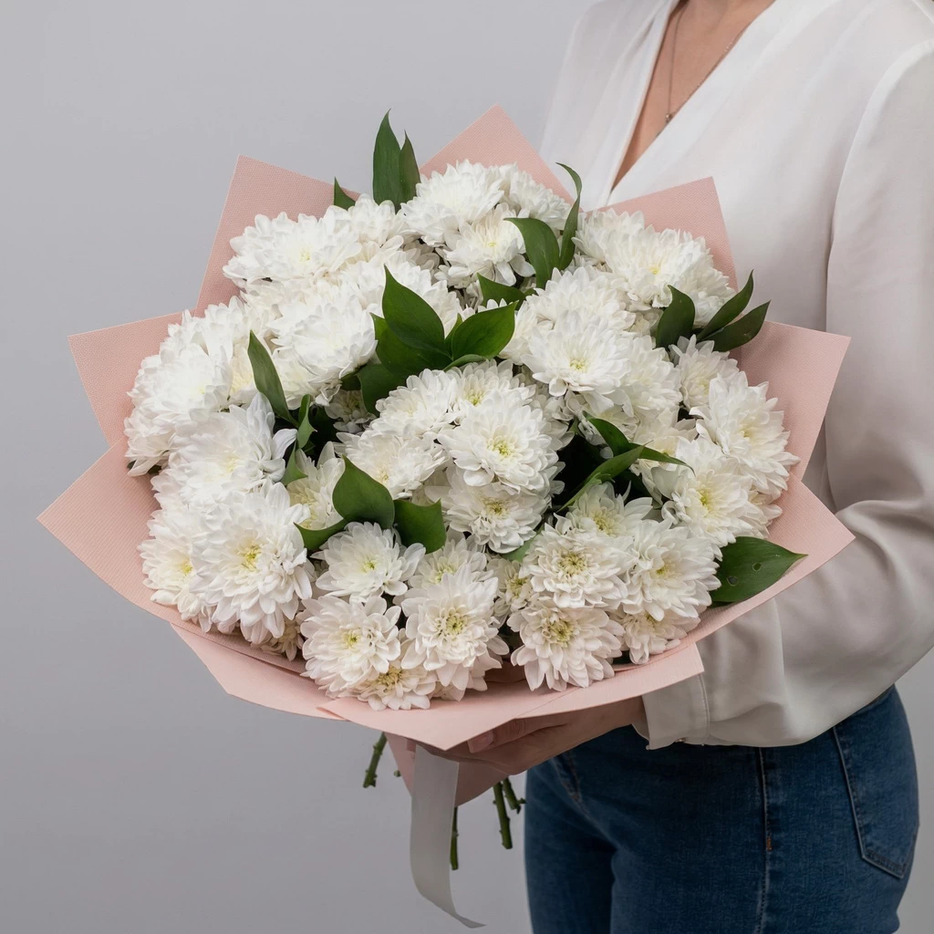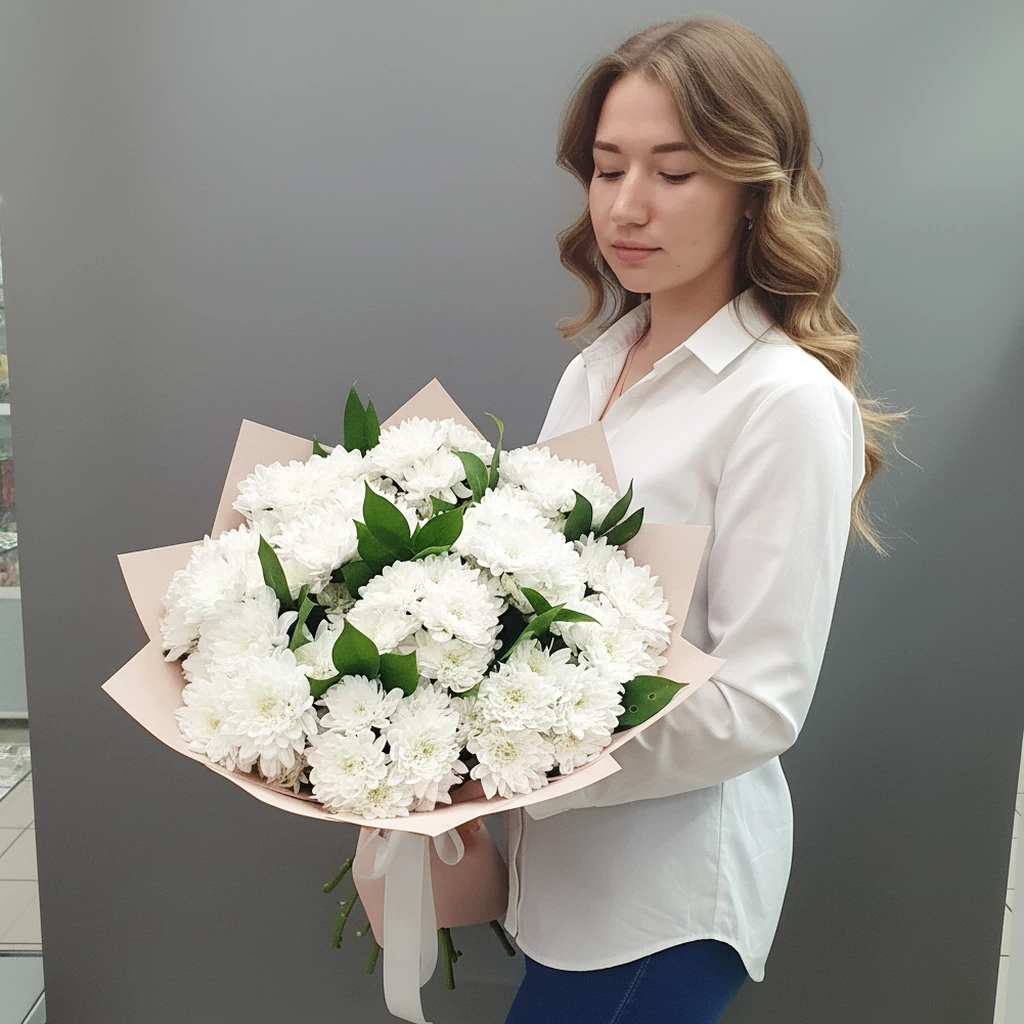 Для тех, кто ценит лаконичную красоту и выбирает моно-букеты. 11 белоснежных кустовых хризантем в обрамлении нежного зелёного рускуса — это не просто цветы, а тихое, уверенное «наше счастье». Чистота, свежесть и светлая радость в каждой веточке.