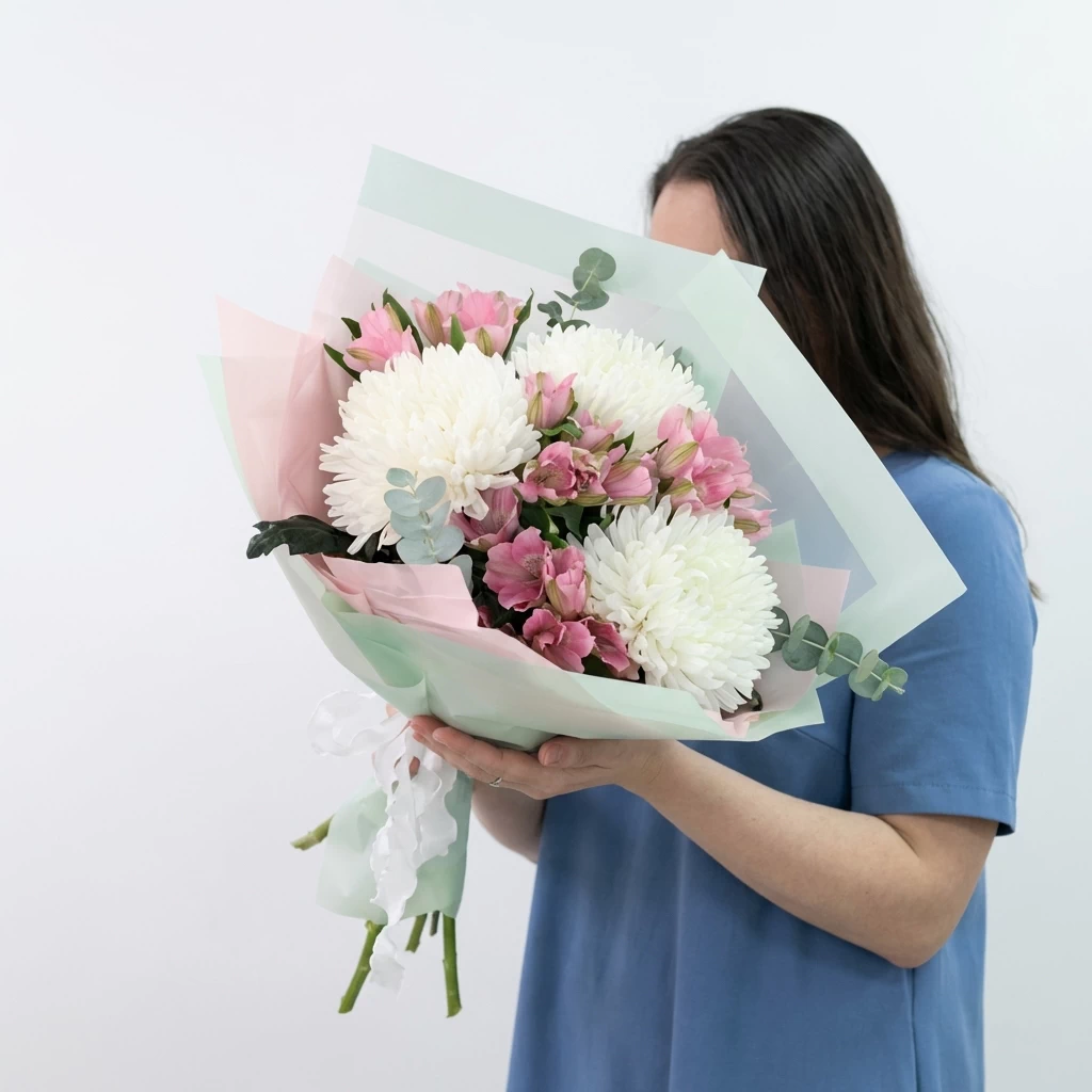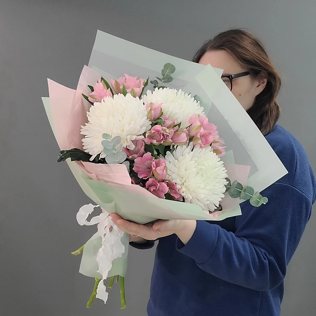 Этот букет — рекордсмен по стойкости. Он сохраняет свежесть до 3 недель, даря радость и восхищение. Крупные «кудрявые» хризантемы «Магнум» создают объём и привлекают внимание, розовая альстромерия добавляет лёгкости и романтичного оттенка, а эвкалипт наполняет композицию приятным освежающим ароматом.