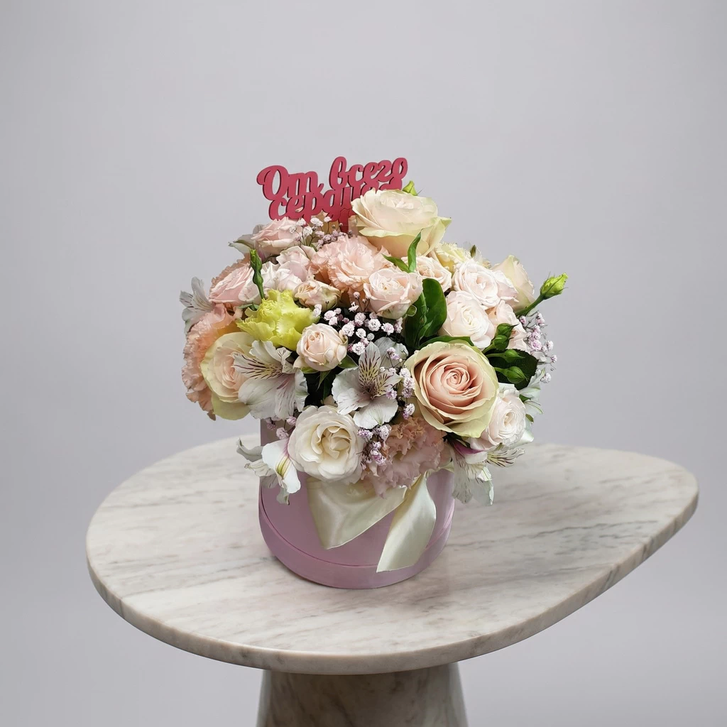 Нежно-розовые розы, кремовая эустома, белая альстромерия, кремовая кустовая роза и гипсофила — в элегантной шляпной коробке. Для самых искренних признаний.