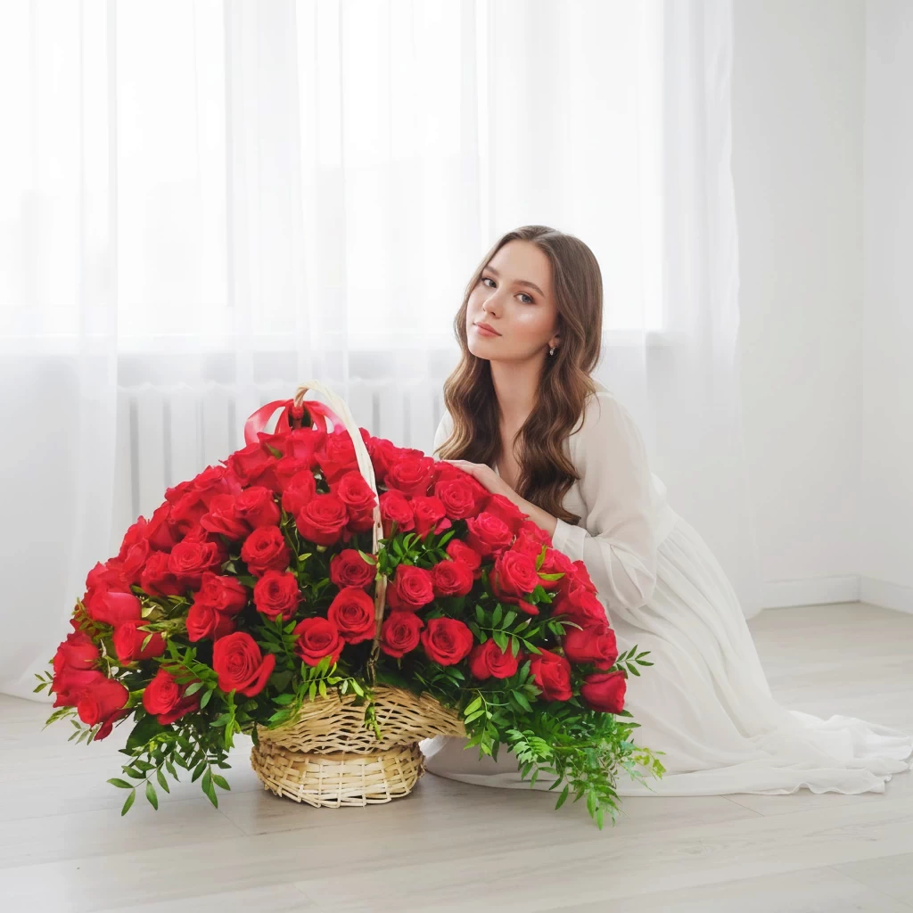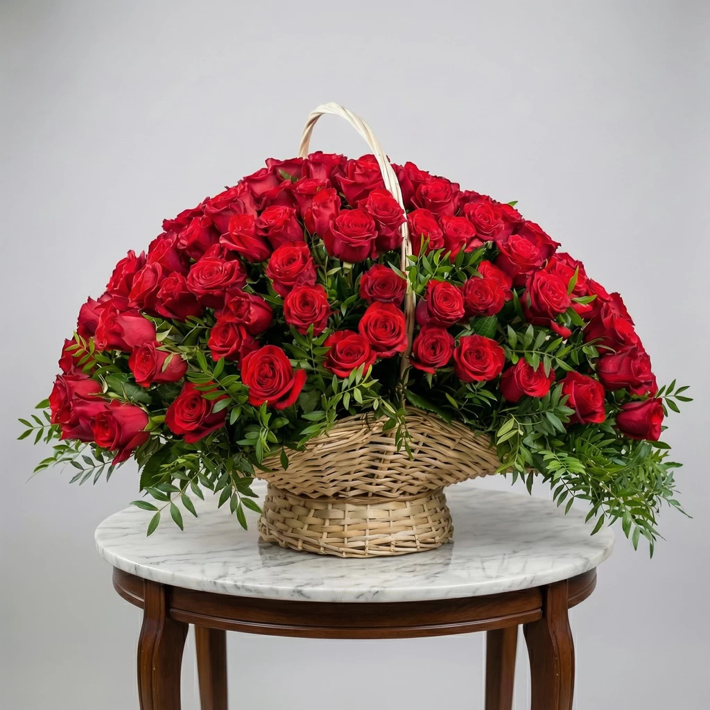 155 эквадорских роз сорта Explorer. Это не просто букет. Это цветочное море, драгоценность, которой можно любоваться бесконечно. Каждый бутон — как рубин, переливающийся в свете. Глубокий бордовый цвет, крупные бокалы, высочайшее качество — и всё это в стильной плетёной корзине, которая подчёркивает статус и масштаб композиции.