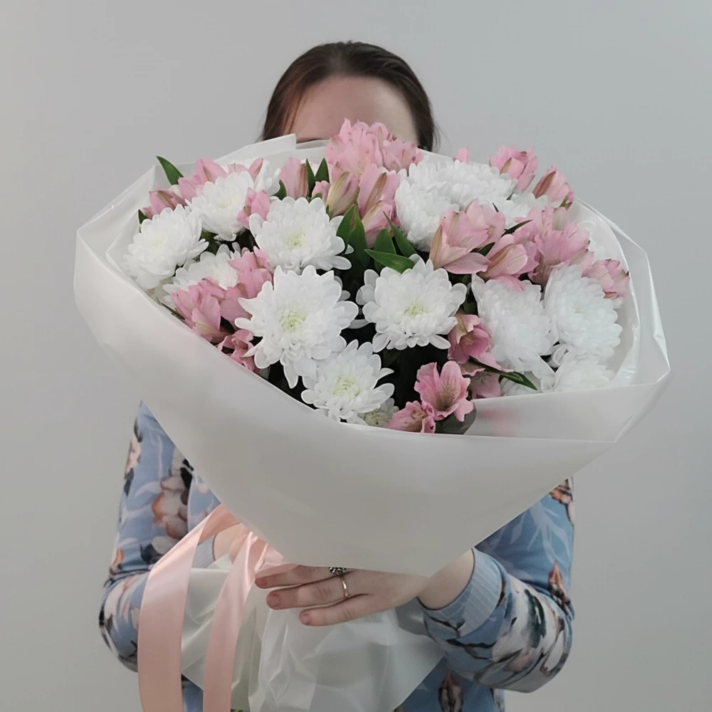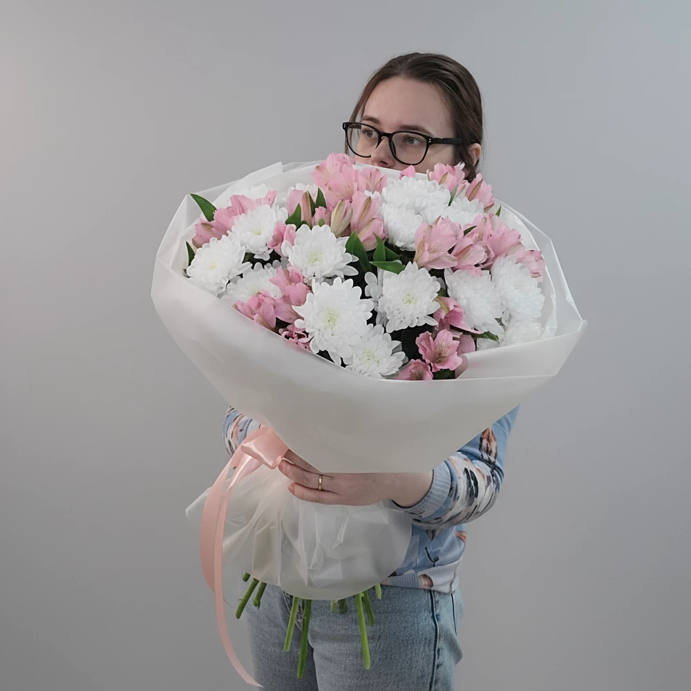Объём и лёгкость одновременно. 7 веток кустовой хризантемы создают пышную основу, а 8 альстромерий добавляют воздушности и изящества.